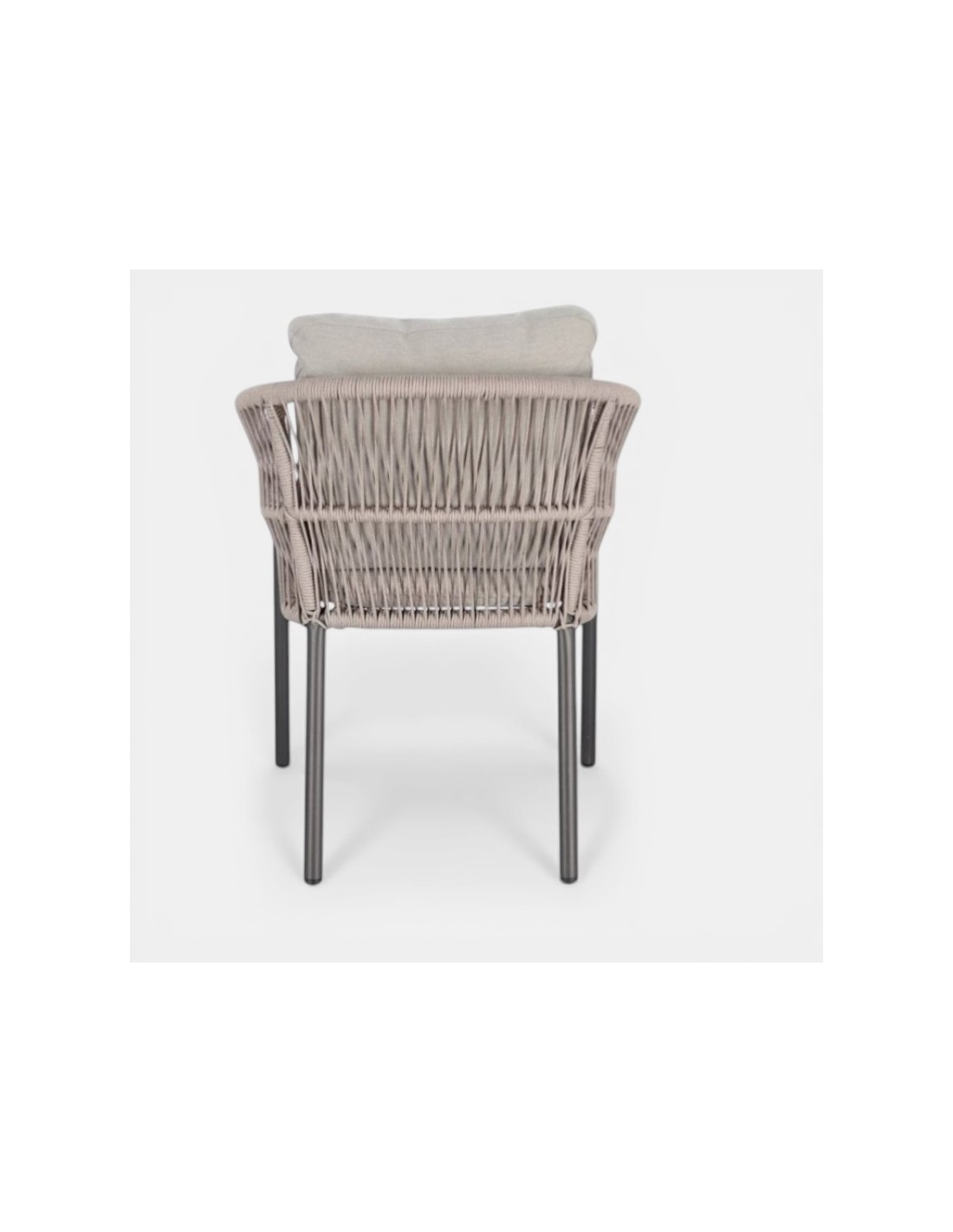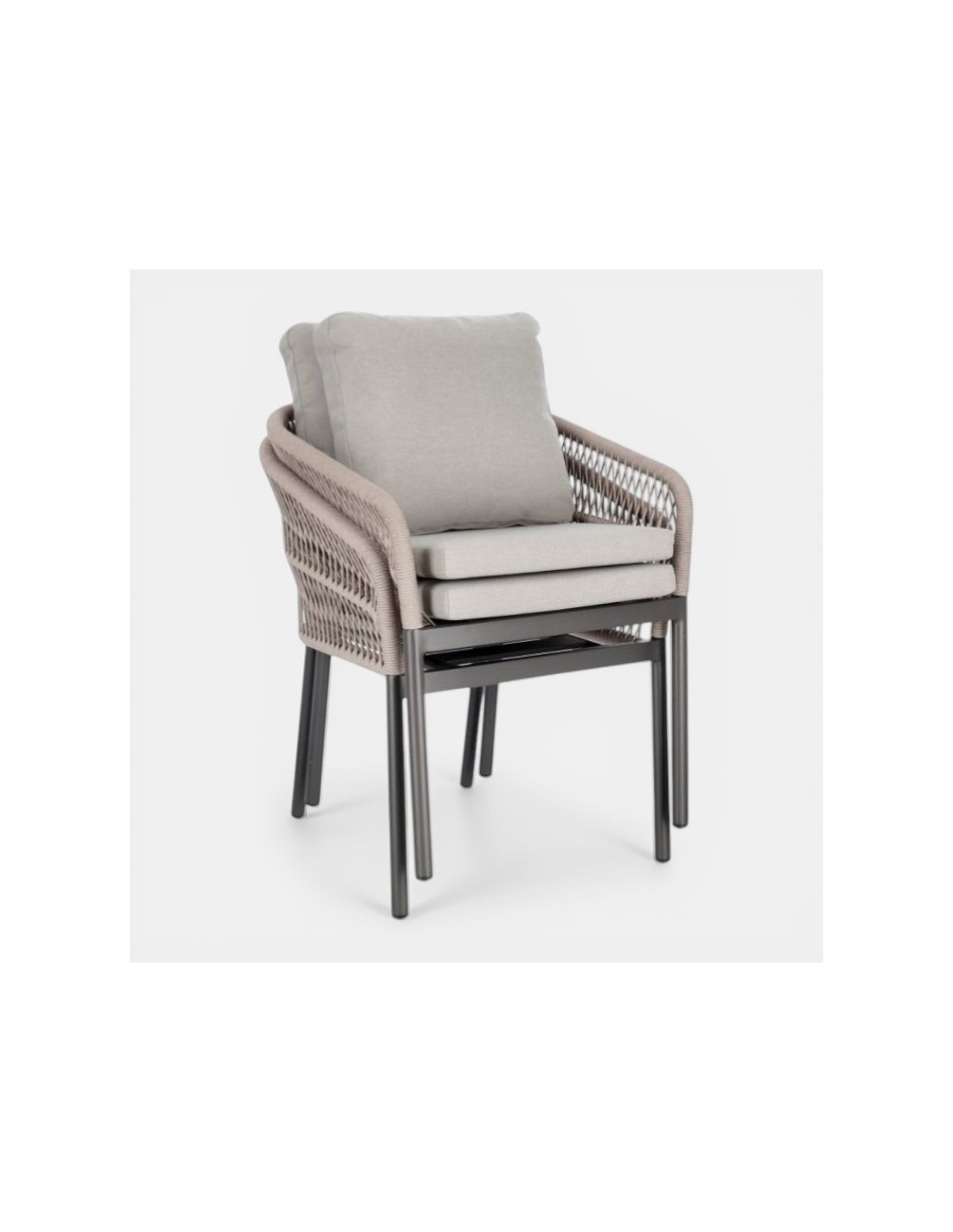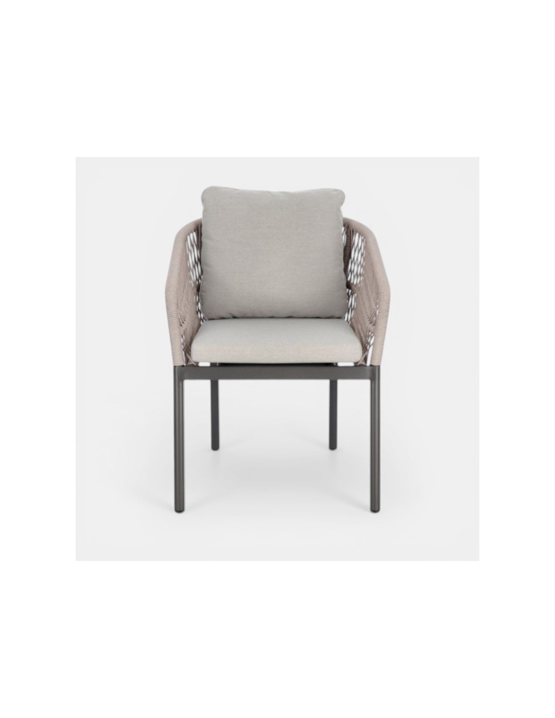 Su estructura de aluminio barnizado con pintura en polvo (poliéster) garantiza resistencia a la intemperie y estabilidad sin renunciar a la ligereza. El respaldo y los reposabrazos incorporan un entramado de cuerda de poliéster de alta calidad en tono natural khaki, aportando un acabado elegante y contemporáneo.