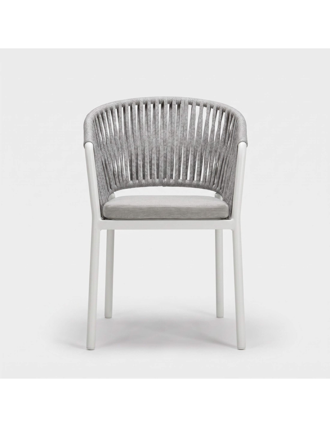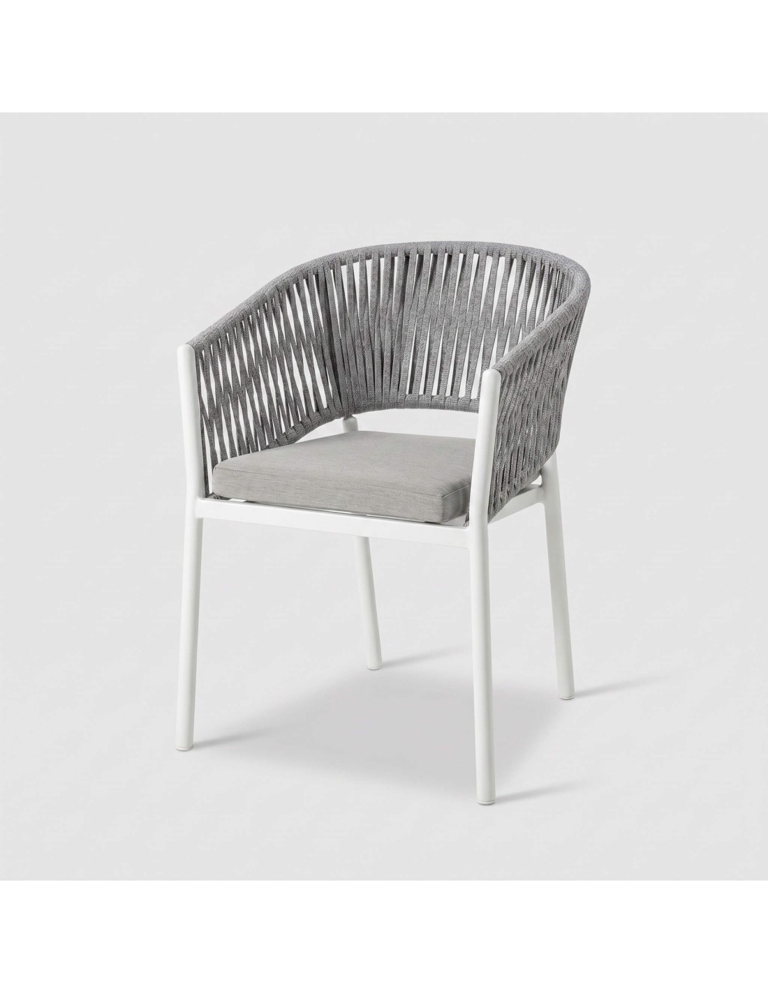 El respaldo envolvente incorpora un elegante trenzado de cuerda de poliéster en tono gris, que proporciona confort ergonómico y un acabado sofisticado. Incluye cojín de asiento desenfundable confeccionado en tejido olefina repelente al agua (100% polipropileno), diseñado para resistir el uso en exteriores.