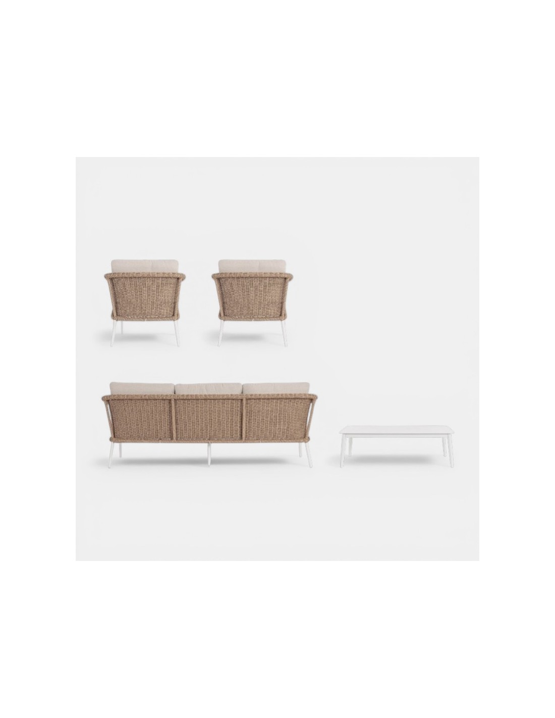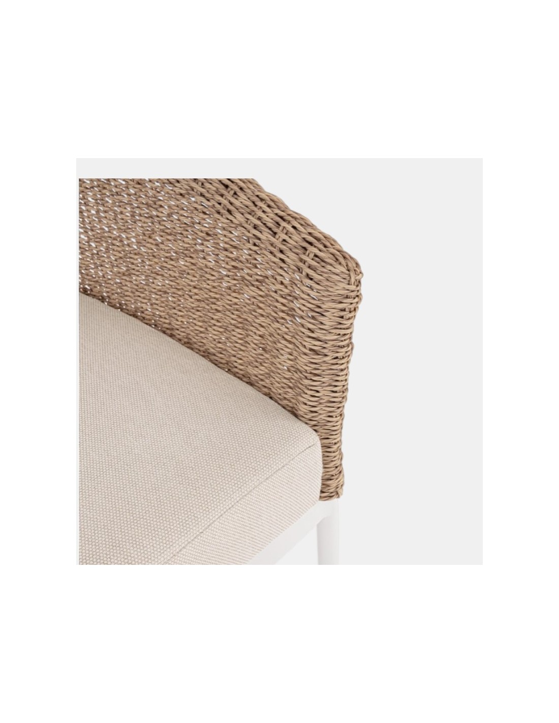 El trenzado en fibra sintética redonda de 3,5 mm reproduce la textura artesanal del mimbre tradicional, pero con mayor resistencia a la humedad y a los cambios climáticos. La estructura interna en aluminio garantiza ligereza, estabilidad y protección frente a la corrosión.