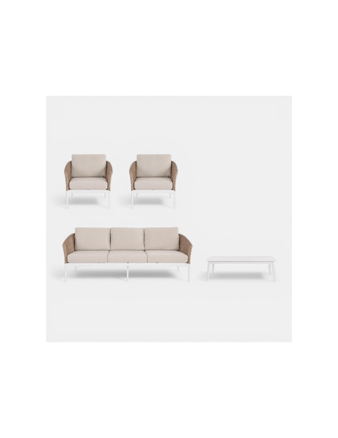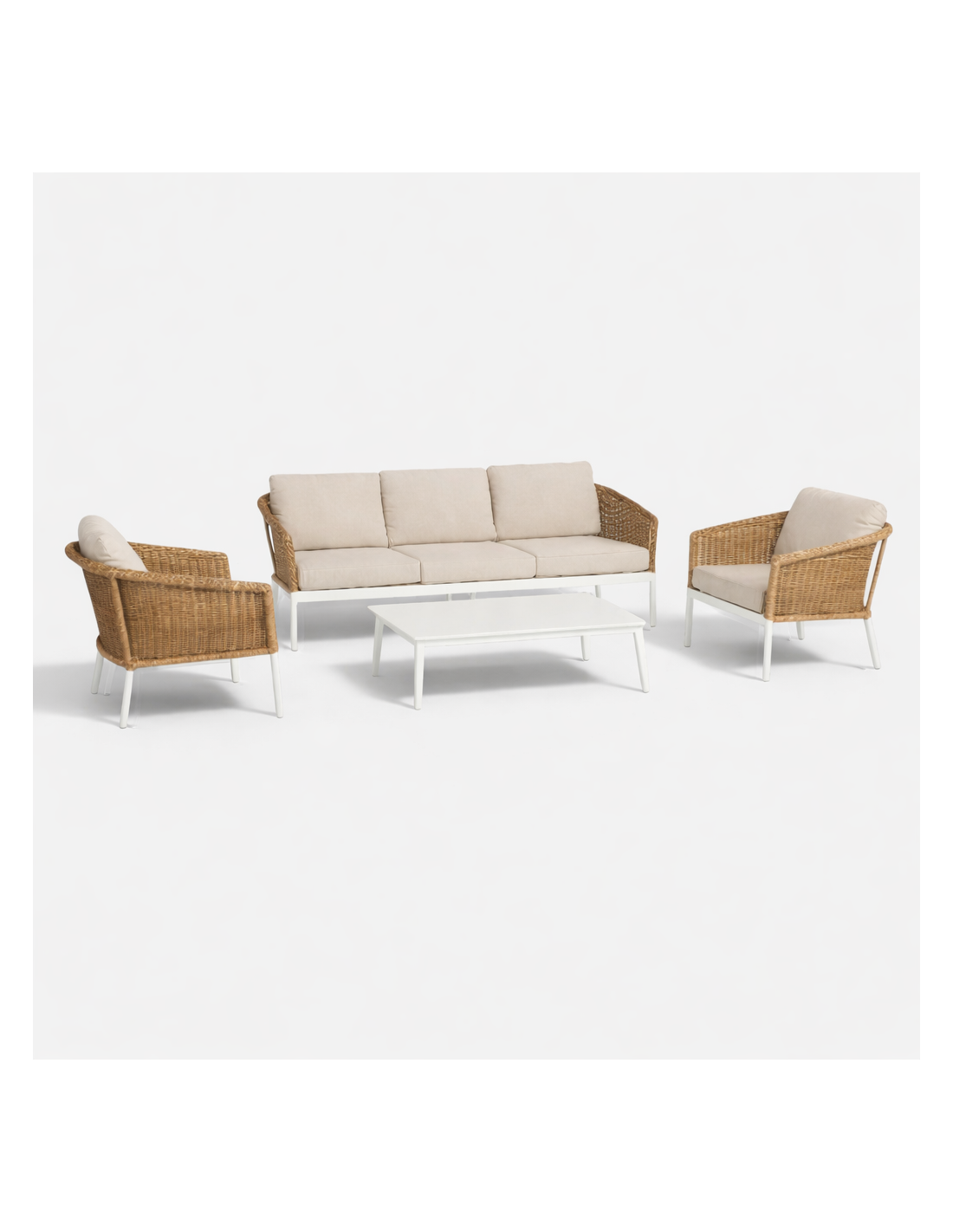 El Set Terraza Lounge ATLANTIC Natural está diseñado para crear ambientes exteriores cálidos, acogedores y sofisticados. Su combinación de estructura ligera en aluminio lacado y trenzado en fibra sintética de alta calidad aporta la estética natural del ratán con la resistencia necesaria para el uso exterior.