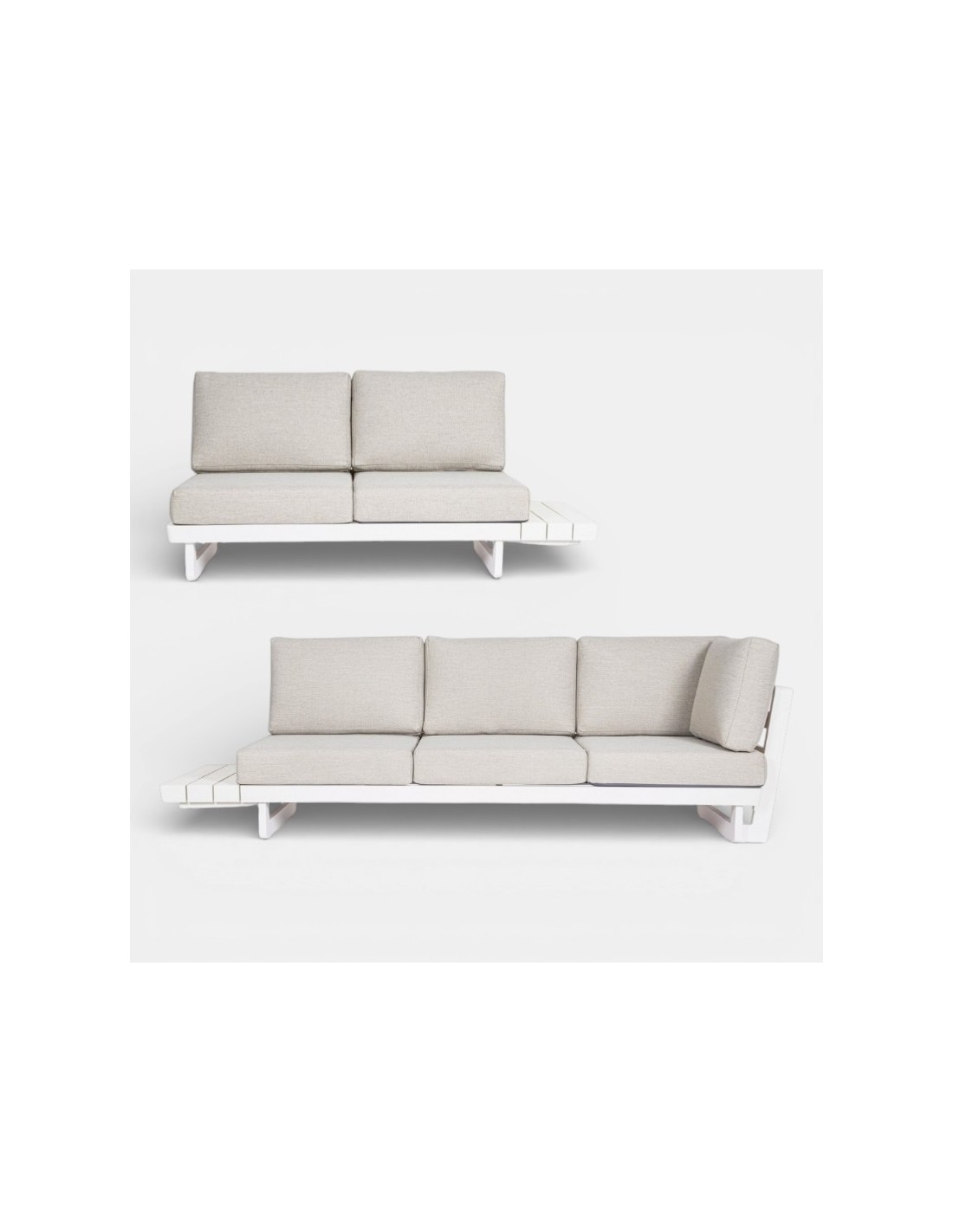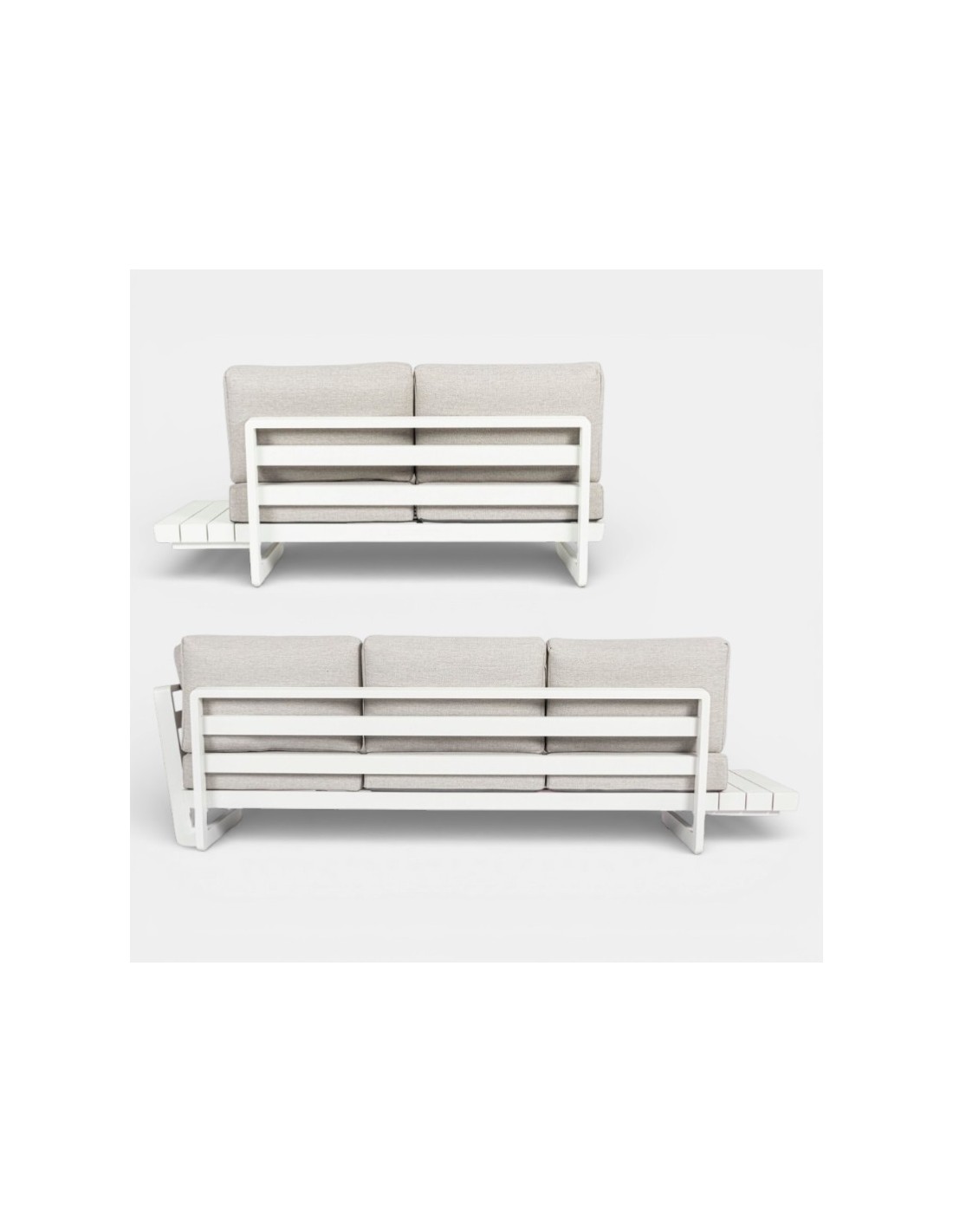 El acabado en estructura blanca con cojines en tonos claros aporta una imagen luminosa, sofisticada y muy mediterránea, ideal para terrazas modernas y jardines de alto nivel.