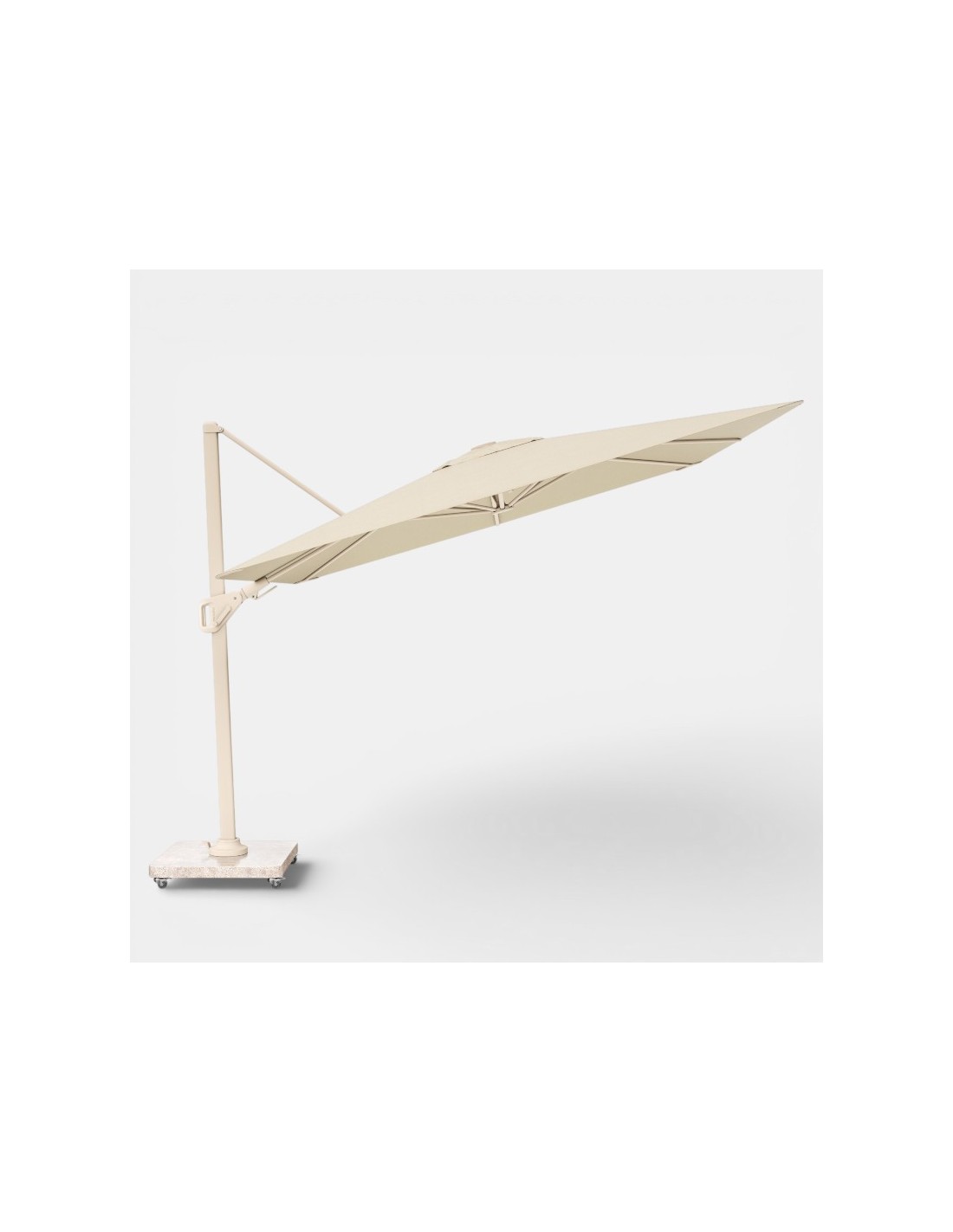 Equipada con el sistema T2 de doble inclinación (lateral + trasera), la sombrilla permite ajustar la sombra de forma precisa en función de la posición del sol.