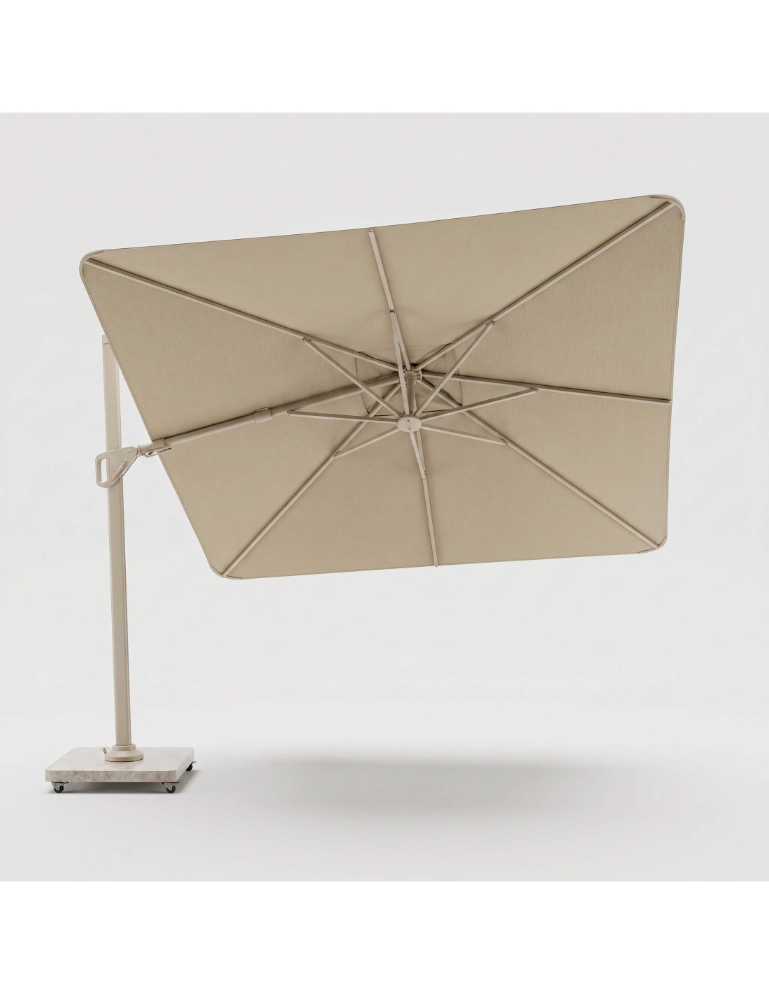 La combinación de estructura en tono sandstone (arena) con lona champagne aporta una armonía cromática suave y elegante, ideal para terrazas modernas y jardines de inspiración mediterránea.
