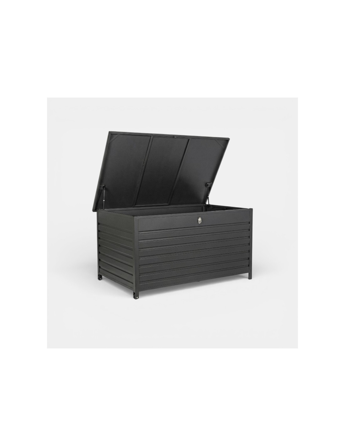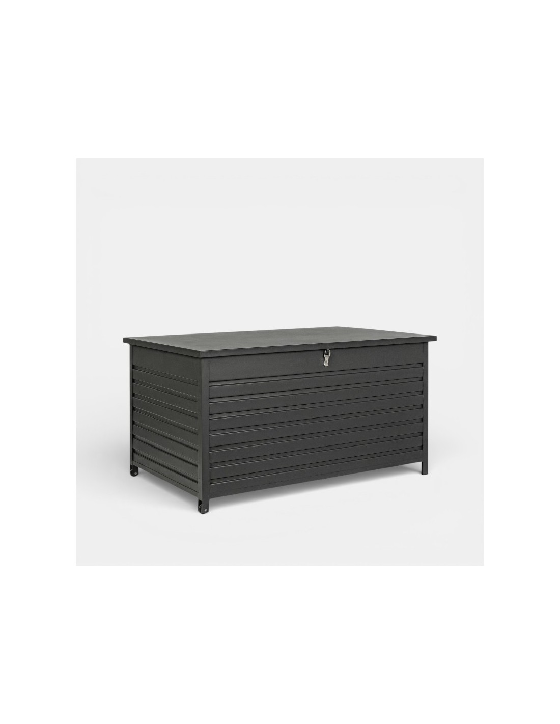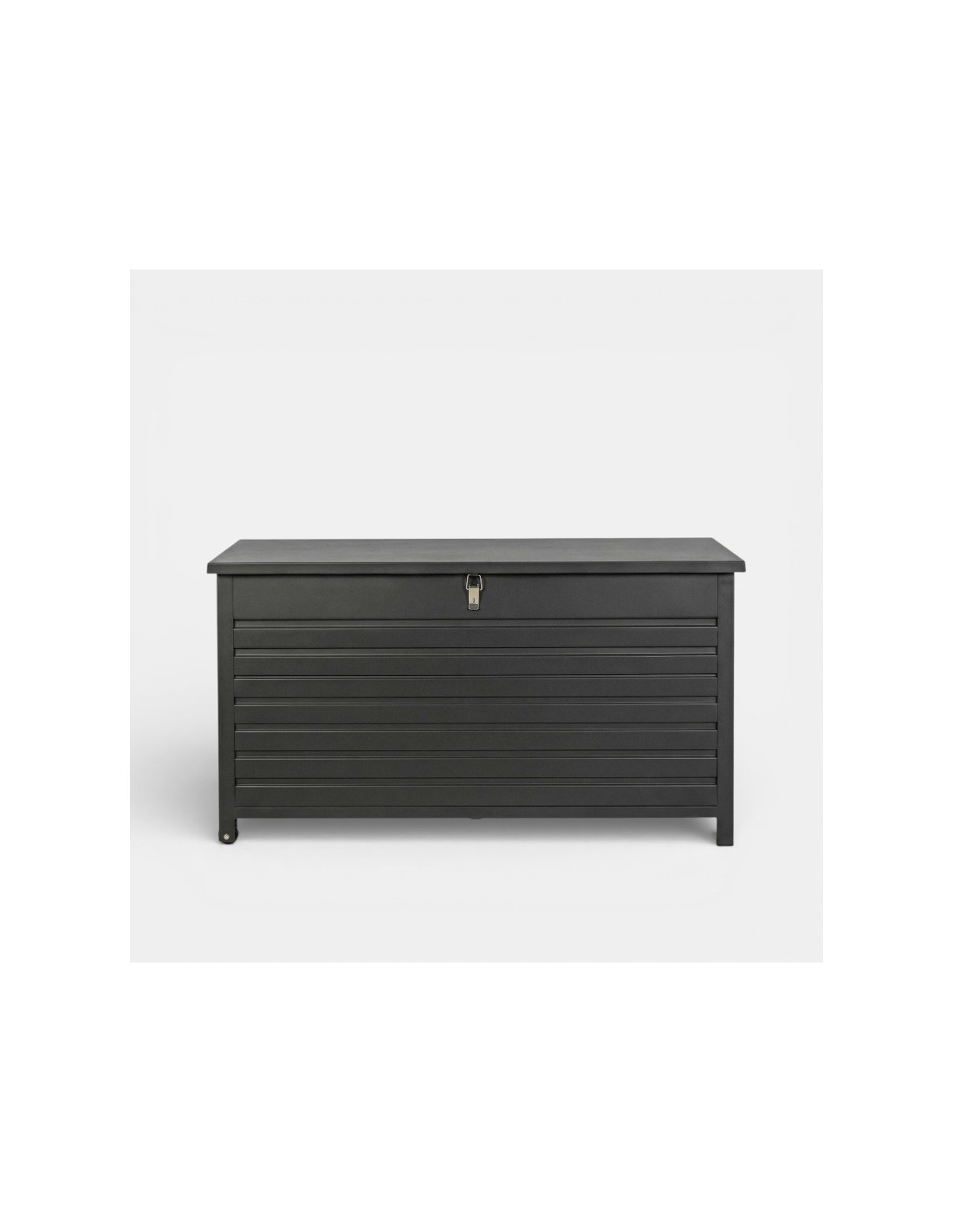 El baúl para exterior ATLAS combina funcionalidad y estética contemporánea gracias a su diseño de lamas horizontales y acabado en color antracita.