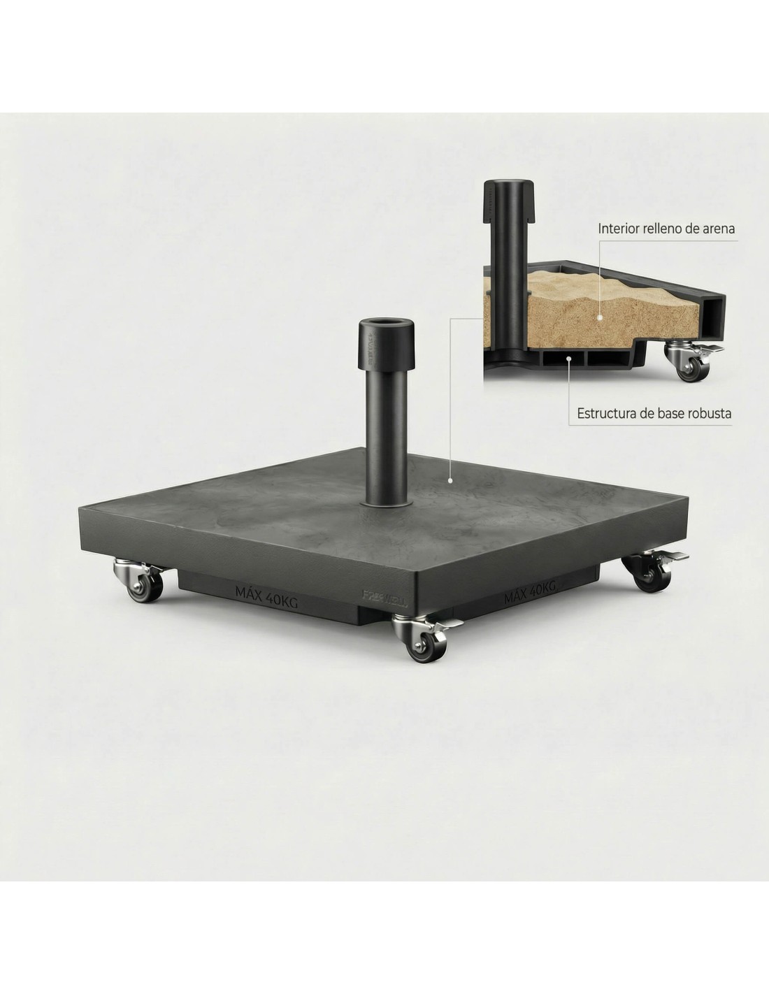 La Base de parasol CERAMICA 40 kg con ruedas Platinum® es la solución ideal para garantizar estabilidad y seguridad en parasoles de mástil central.