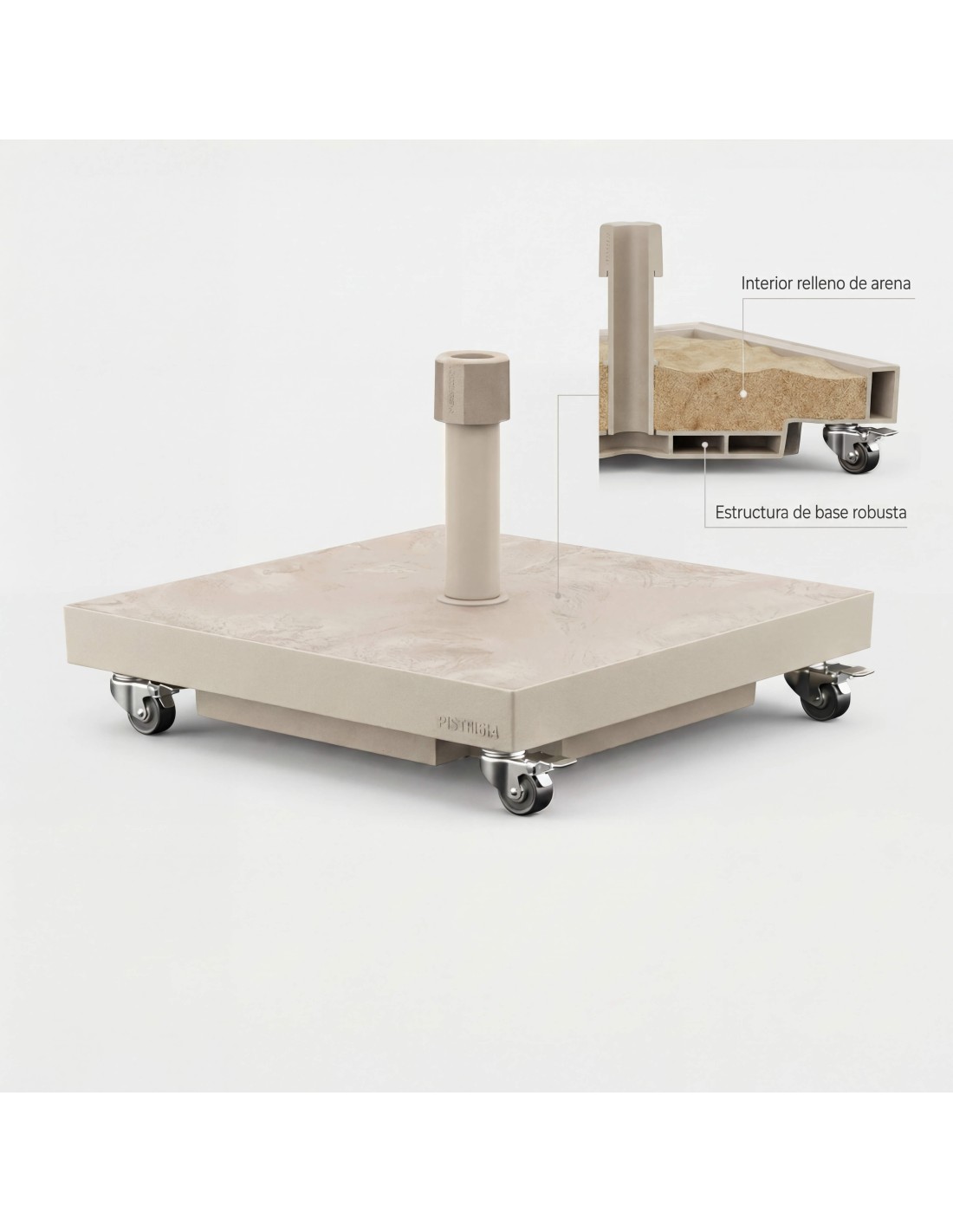 La Base de parasol CERAMICA 40 kg con ruedas sandstone Platinum® está diseñada para ofrecer estabilidad, resistencia y facilidad de uso en parasoles de mástil central.