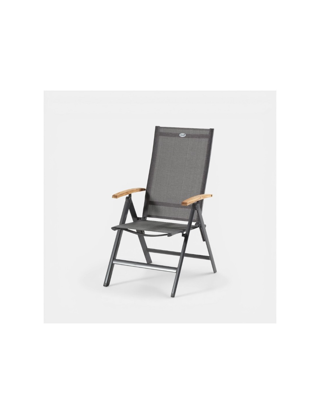 Su estructura de aluminio en color antracita aporta ligereza y durabilidad, mientras que los reposabrazos en teca natural certificada FSC añaden un toque cálido y sofisticado. El asiento y respaldo en textilene garantizan transpirabilidad y fácil mantenimiento.