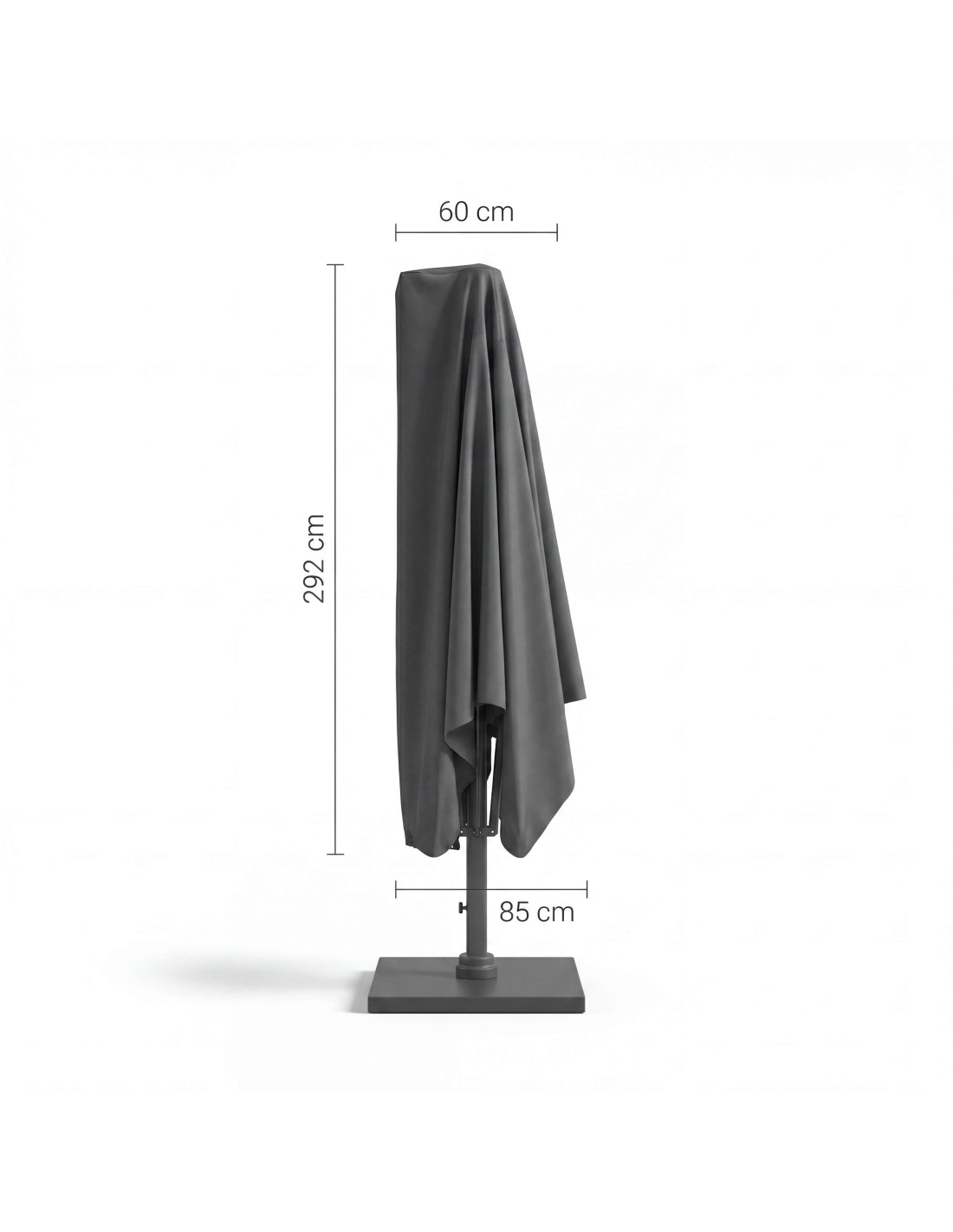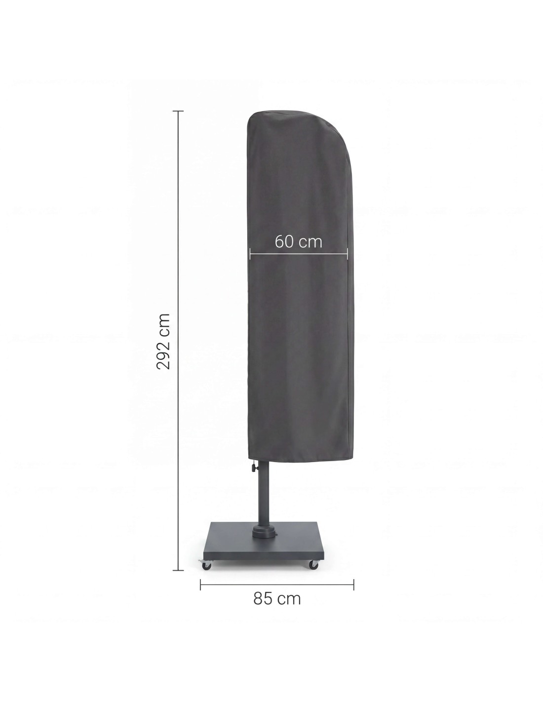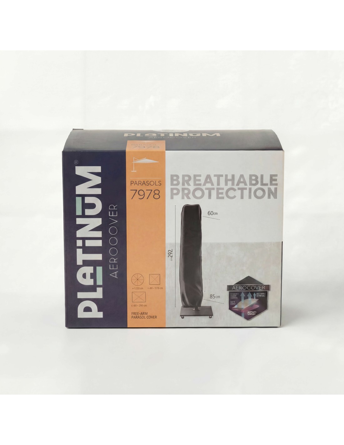La funda Platinum® AeroCover , está especialmente diseñada para proteger parasoles excéntricos o de brazo lateral (free-arm), ofreciendo una solución práctica, resistente y duradera para exteriores.