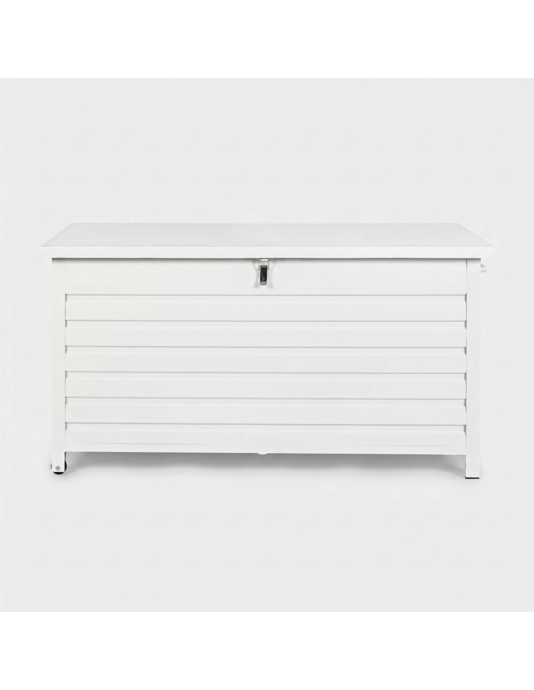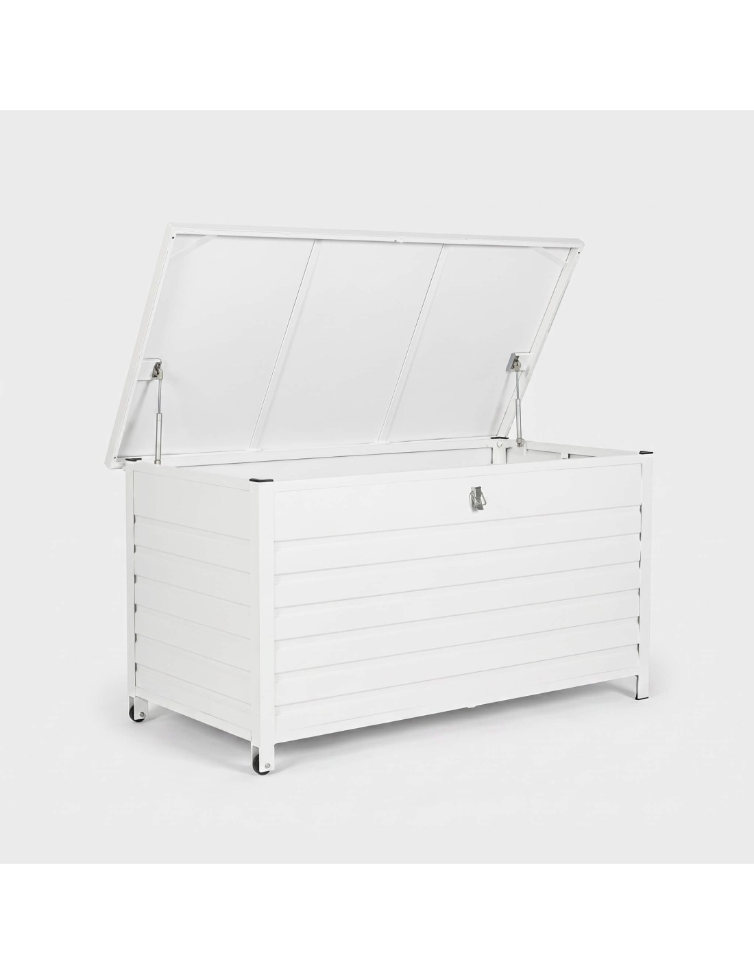 El baúl para exterior ATLAS "L" combina funcionalidad y estética contemporánea gracias a su diseño de lamas horizontales y acabado en color blanco.