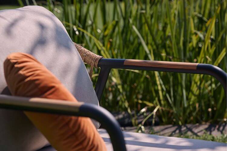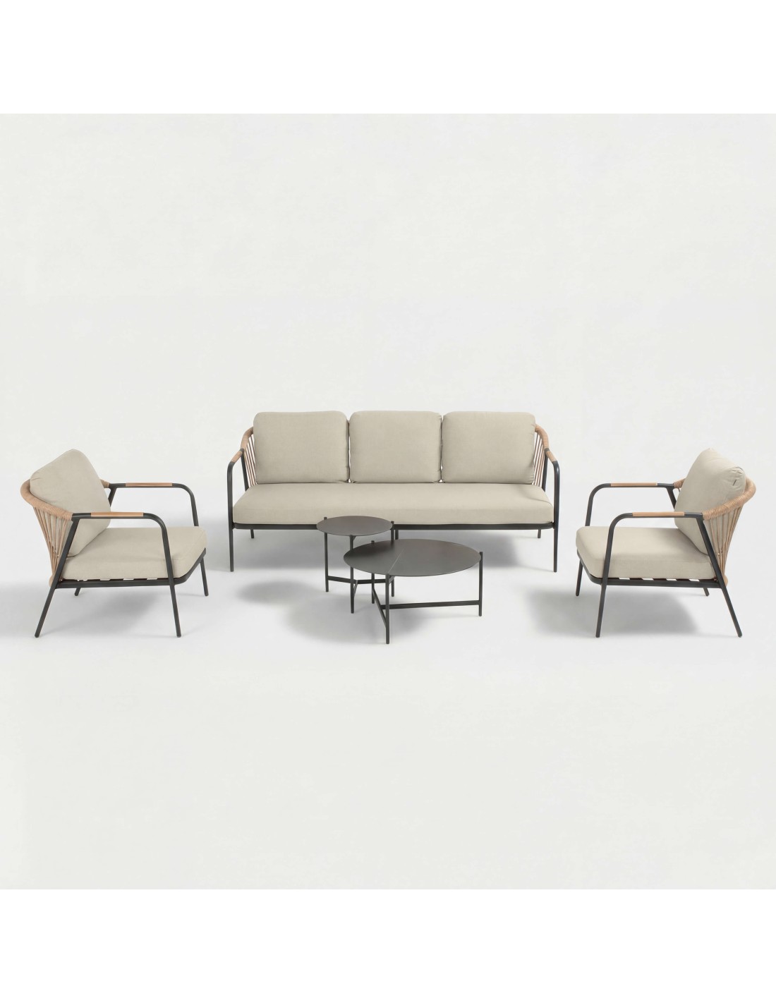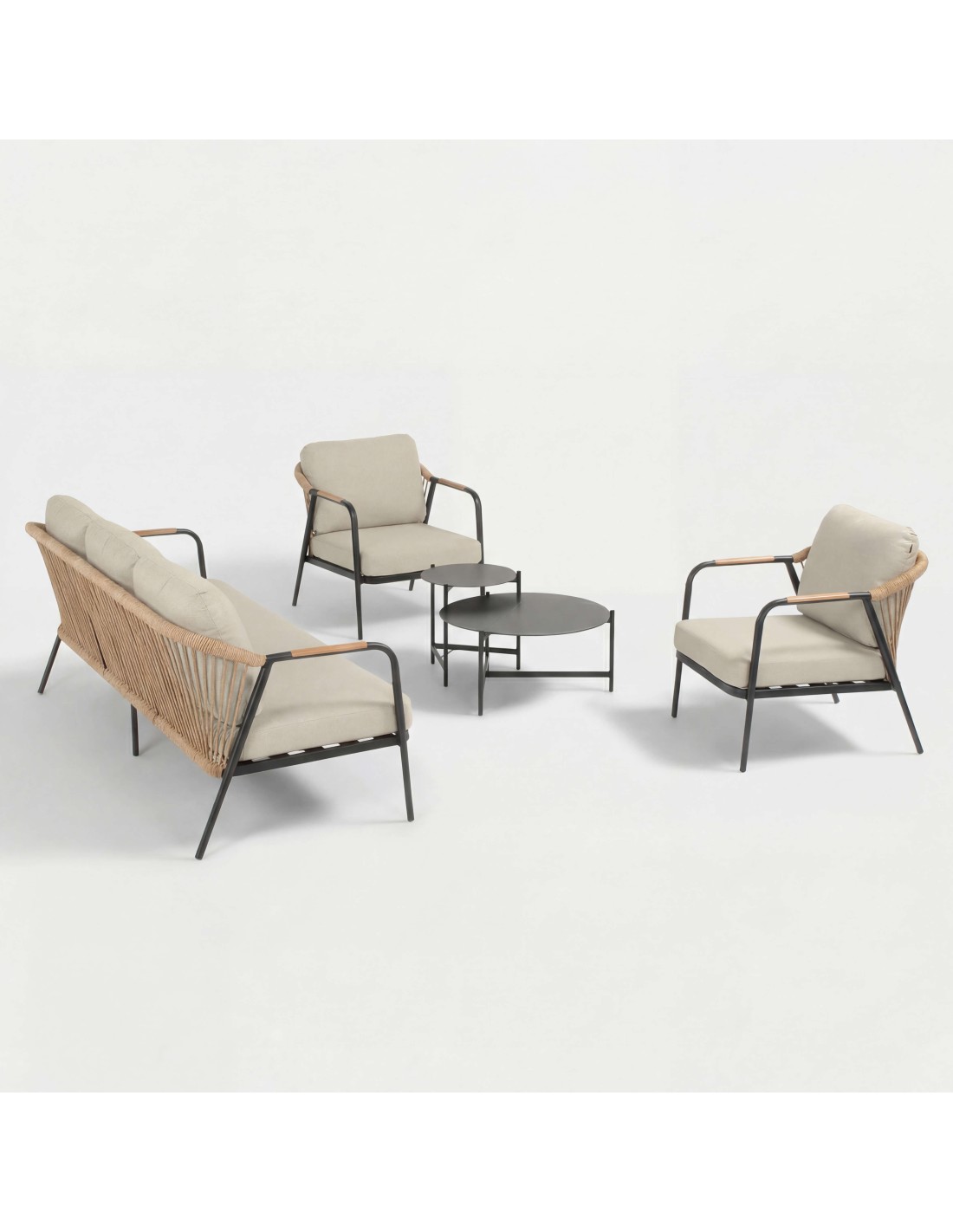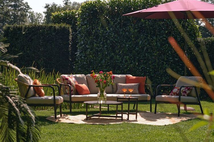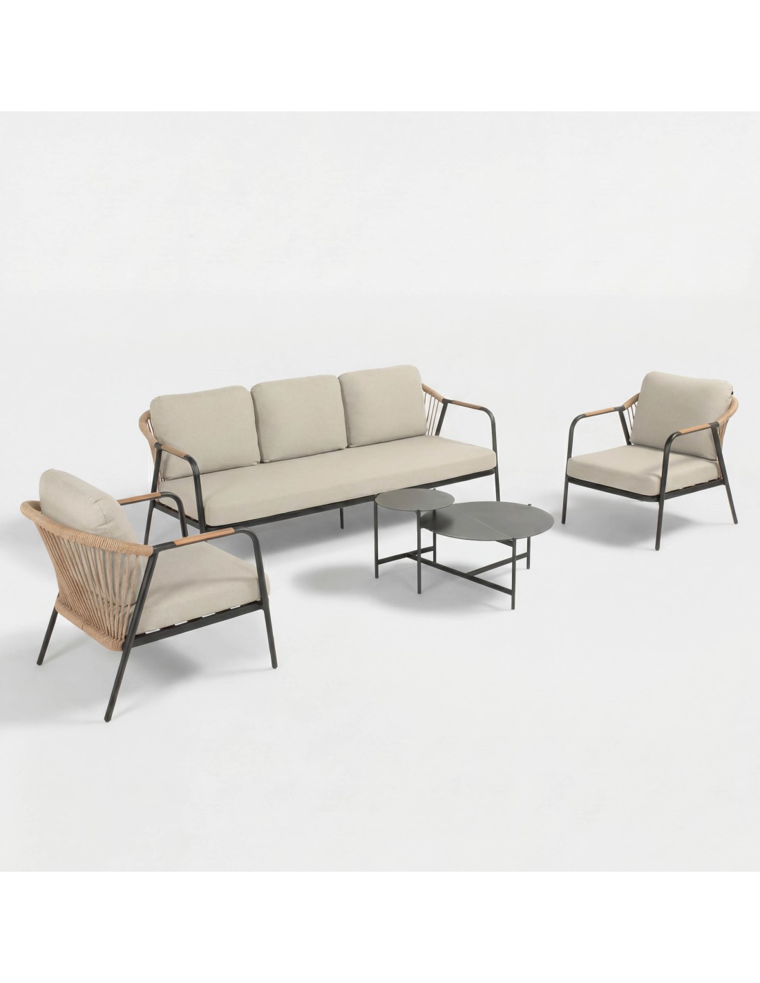 El conjunto de jardín NICE es un moderno set de terraza compuesto por un sofá de tres plazas, dos sillones individuales y un conjunto de mesa nido que integra dos mesas de diferentes tamaños. Es un conjunto perfecto para un jardín, terraza, patio o balcón ancho. Su estructura soporta diferentes condiciones climáticas. En caso de lluvia, recomendamos recoger los cojines o, mucho más cómodo, proteger el set con una de nuestras fundas impermeables y transpirables.